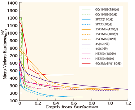 Surface hardness and hardened layer depth provided by ISONITE are dependent on material. It can also process SUS and cast iron materials, which are usually difficult to heat treat.