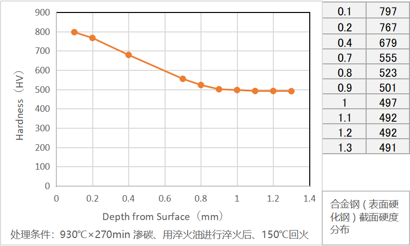 能確保表層附近約800HV的高硬度、整體硬化層深度約0.9mm左右。